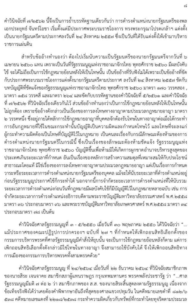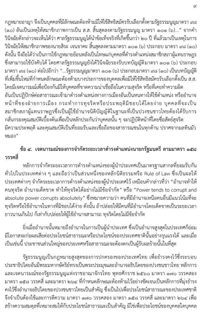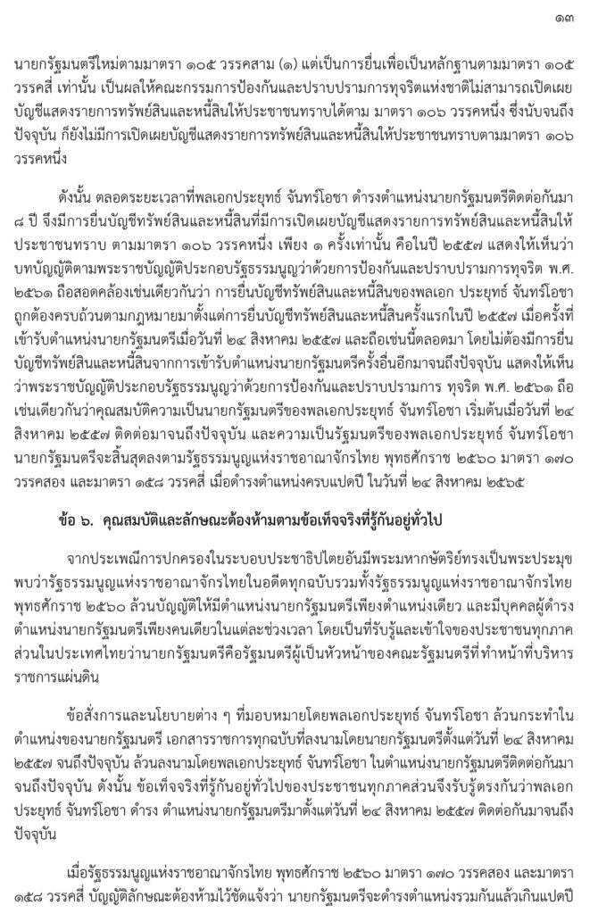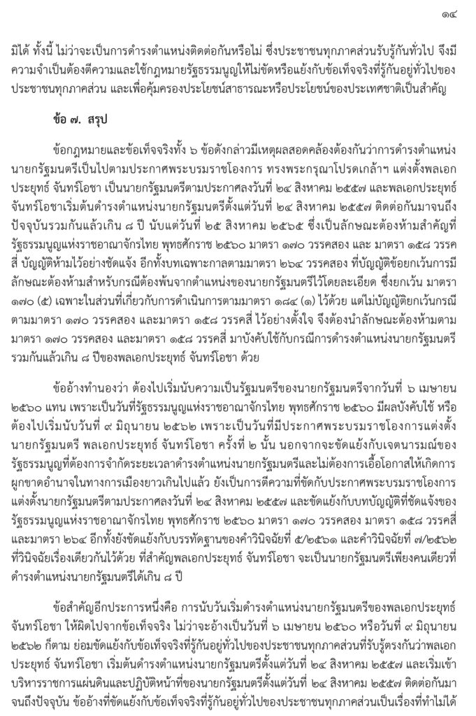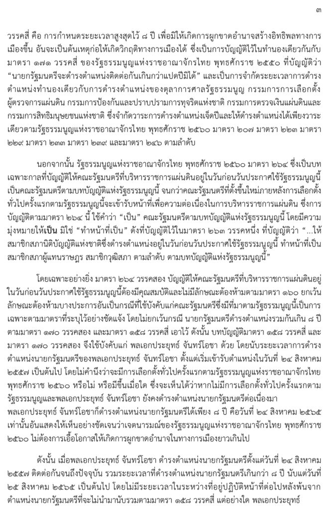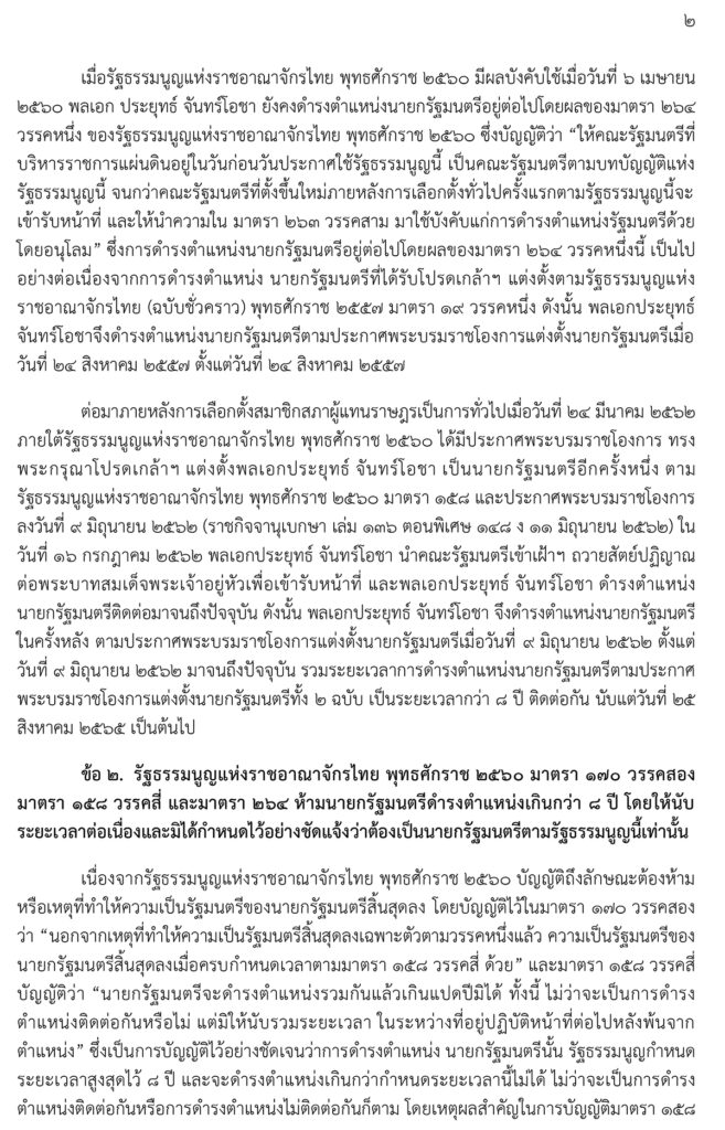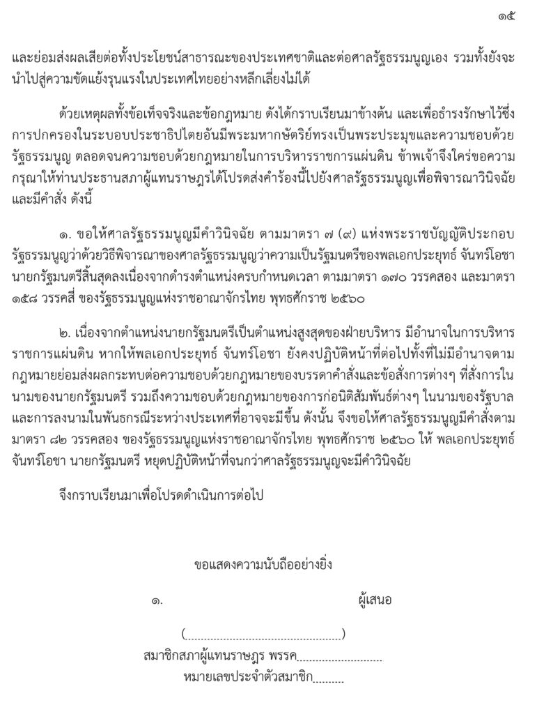 ขอให้ส่งคำร้องไปยังศาลรัฐธรรมนูญเพื่อพิจารณาวินิจฉัยความเป็นนายกรัฐมนตรีของพลเอกประยุทธ์จันทร์โอชา สิ้นสุดลง เนื่องจากดำรงตำแหน่งนายกรัฐมนตรีรวมระยะเวลาเกินกว่า 8 ปี ตามมาตรา ๑๗๐ วรรคสอง และมาตรา ๑๕๘ วรรคสี่ ของรัฐธรรมนูญแห่งราชอาณาจักรไทย พุทธศักราช ๒๕๖