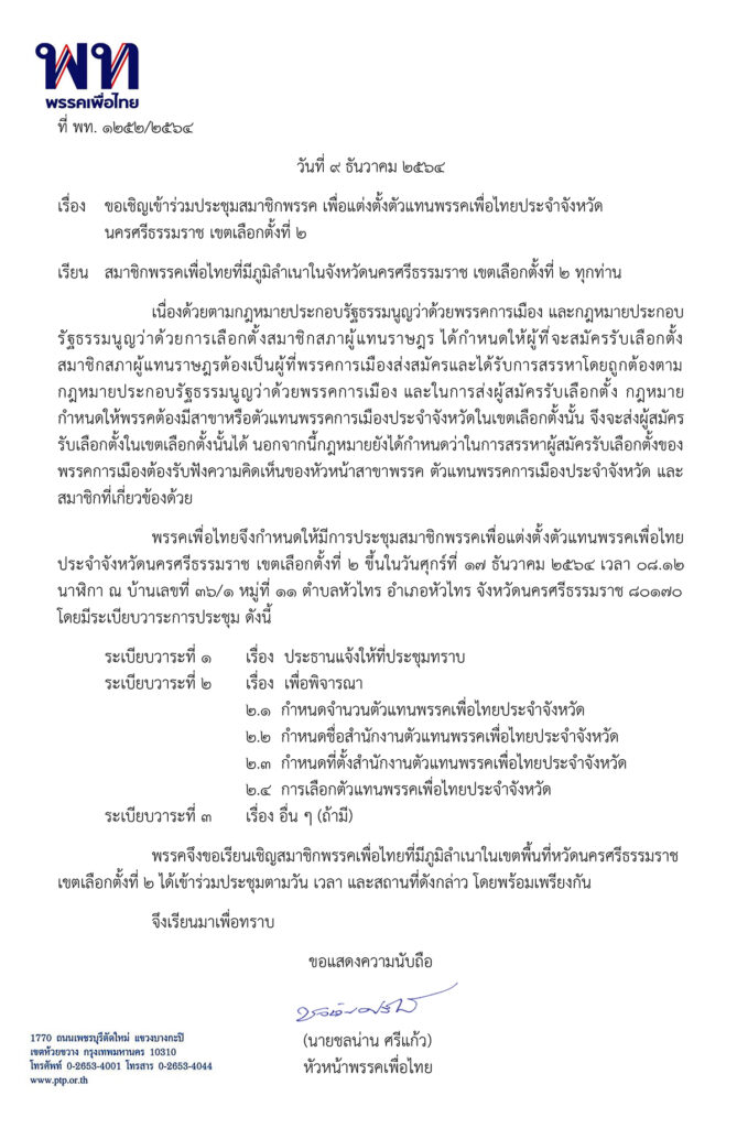 ขอเชิญเข้าร่วมประชุมสมาชิกพรรคเพื่อแต่งตั้งตัวแทนพรรคเพื่อไทยประจำจังหวัดนครศรีธรรมราช เขตเลือกตั้งที่ ๒