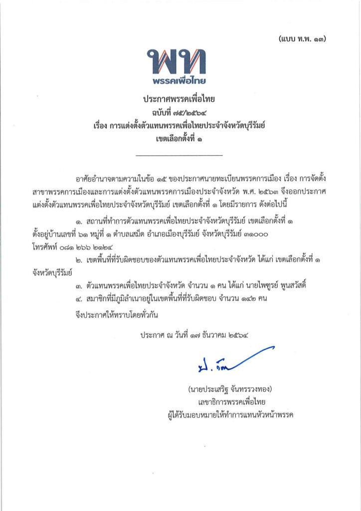 ประกาศพรรคเพื่อไทย ฉบับที่ ๗๕ ปี ๒๕๖๔ เรื่อง การแต่งตั้งตัวแทนพรรคเพื่อไทยประจำจังหวัดบุรีรัมย์ เขตเลือกตั้งที่ ๑