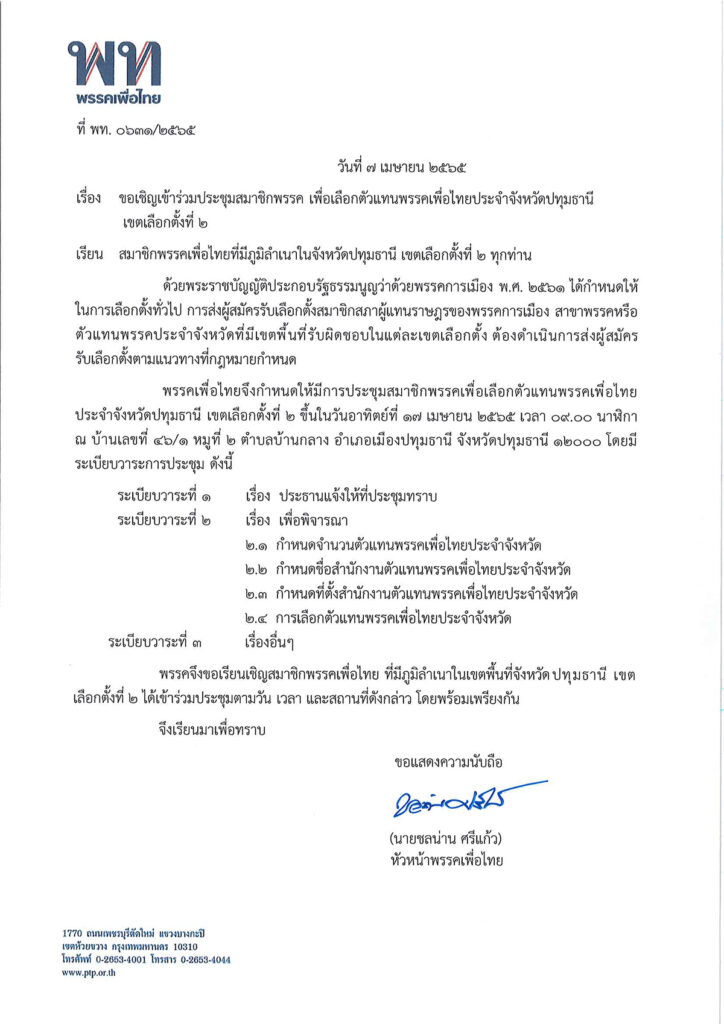 ขอเชิญเข้าร่วมประชุมสมาชิกพรรคเพื่อเลือกตัวแทนพรรคเพื่อไทยประจำจังหวัดปทุมธานี เขตเลือกตั้งที่ ๒