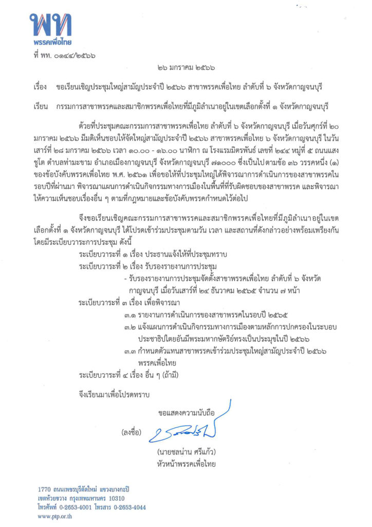 ขอเรียนเชิญประชุมใหญ่สามัญประจำปี ๒๕๖๖ สาขาพรรคเพื่อไทย ลำดับที่ ๖ จังหวัดกาญจนบุรี