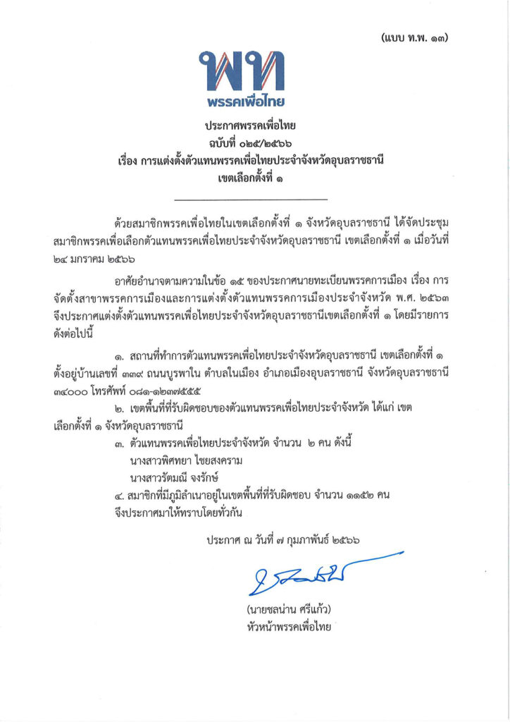 ประกาศพรรคเพื่อไทย ฉบับที่ ๐๒๕ ปี ๒๕๖๖ เรื่อง การแต่งตั้งตัวแทนพรรคเพื่อไทยประจำจังหวัดอุบลราชธานี เขตเลือกตั้งที่ ๑