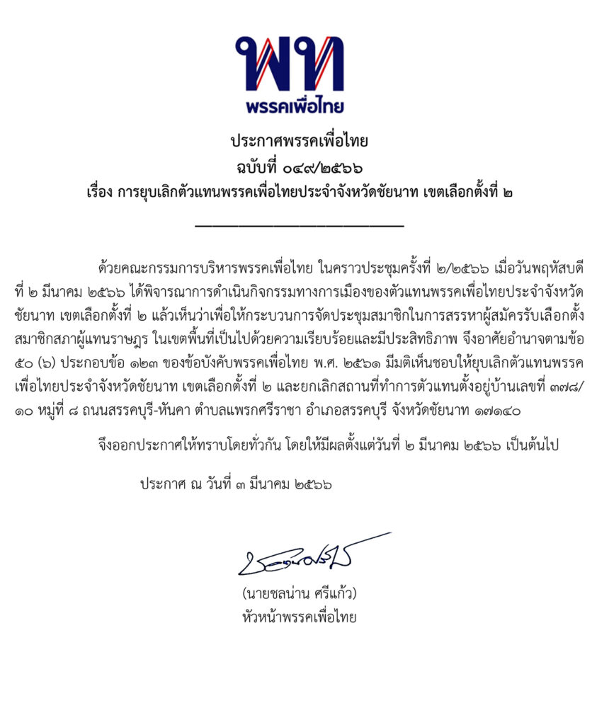 ประกาศพรรคเพื่อไทย ฉบับที่ ๐๔๙ ปี ๒๕๖๖ เรื่อง การยุบเลิกตัวแทนพรรคเพื่อไทยประจำจังหวัดชัยนาท เขตเลือกตั้งที่ ๒