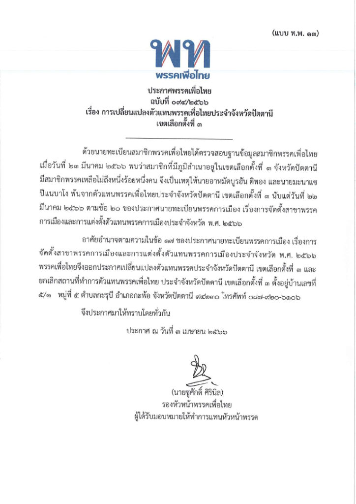 ประกาศพรรคเพื่อไทย ฉบับที่ ๐๙๔ ปี ๒๕๖๖ เรื่อง การเปลี่ยนแปลงตัวแทนพรรคเพื่อไทยประจำจังหวัดปัตตานี เขตเลือกตั้งที่ ๓