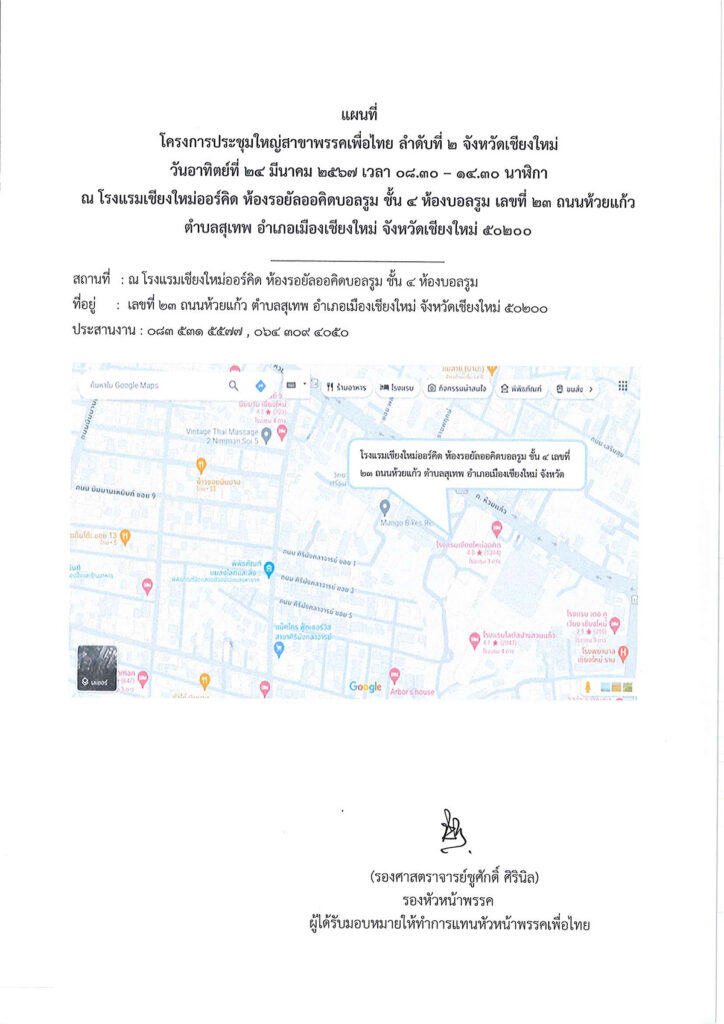 ขอเชิญกรรมการสาขาพรรคและสมาชิกพรรคเข้าร่วมประชุมใหญ่สามัญประจำปี ๒๕๖๗ สาขาพรรคเพื่อไทย ลำดับที่ ๒ จังหวัดเชียงใหม่