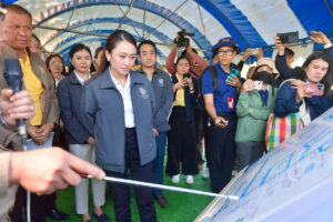 จากนั้นในเวลา 15.00 น. ณ บริเวณประตูดำ ศูนย์วิจัยและพัฒนาประมงน้ำจืดนครสวรรค์ อำเภอเมืองนครสวรรค์ จังหวัดนครสวรรค์ นางสาวแพทองธาร ชินวัตร นายกรัฐมนตรีตรวจติดตามการบริหารจัดการน้ำและการขุดลอกพื้นที่กักเก็บน้ำ โดยมีนายสมจิตฐิพงศ์ อำนาจศาล ผู้อำนวยการสำนักงานชลประทานที่ 3 บรรยายสรุปว่า การรับน้ำในพื้นที่ภาคเหนือมีเขื่อนขนาดใหญ่ รวมถึงใช้แก้มลิงและพื้นที่รับน้ำทางธรรมชาติ เพื่อบริหารจัดการน้ำจากพื้นที่ด้านบน ก่อนจะไหลลงมาสู่พื้นที่ชั้นใน โดยมีจุดรับน้ำหลักประมาณ 8 แห่ง เช่น บึงบอระเพ็ด จังหวัดนครสวรรค์ โดยในช่วงฤดูฝน บึงบอระเพ็ดจะเป็นพื้นที่รับน้ำจากทุ่งด้านบน ในเขตอำเภอไพศาลี อำเภอท่าตะโก และยังช่วยชะลอน้ำหลากที่จะไหลไปสมทบกับแม่น้ำน่าน แต่หากระดับน้ำในแม่น้ำน่านมีระดับสูงก็จะเปิดประตูระบายน้ำ (ประตูดำ) เพื่อช่วยระบายน้ำและลดอุทกภัยในพื้นที่ ทั้งนี้ เพื่อเพิ่มประสิทธิภาพการบริหารจัดการน้ำฯ กรมชลประทานได้เตรียมดำเนินการขุดลอกพื้นที่กักเก็บน้ำพื้นที่ประตูดำ ศูนย์วิจัยและพัฒนาประมงน้ำจืดนครสวรรค์เพื่อบริหารจัดการน้ำช่วงฤดูแล้ง ปี 2567/2568 โดยกรมชลประทานได้ตั้งงบประมาณในการขุดลอกกว่า 2,000 ล้านบาท
