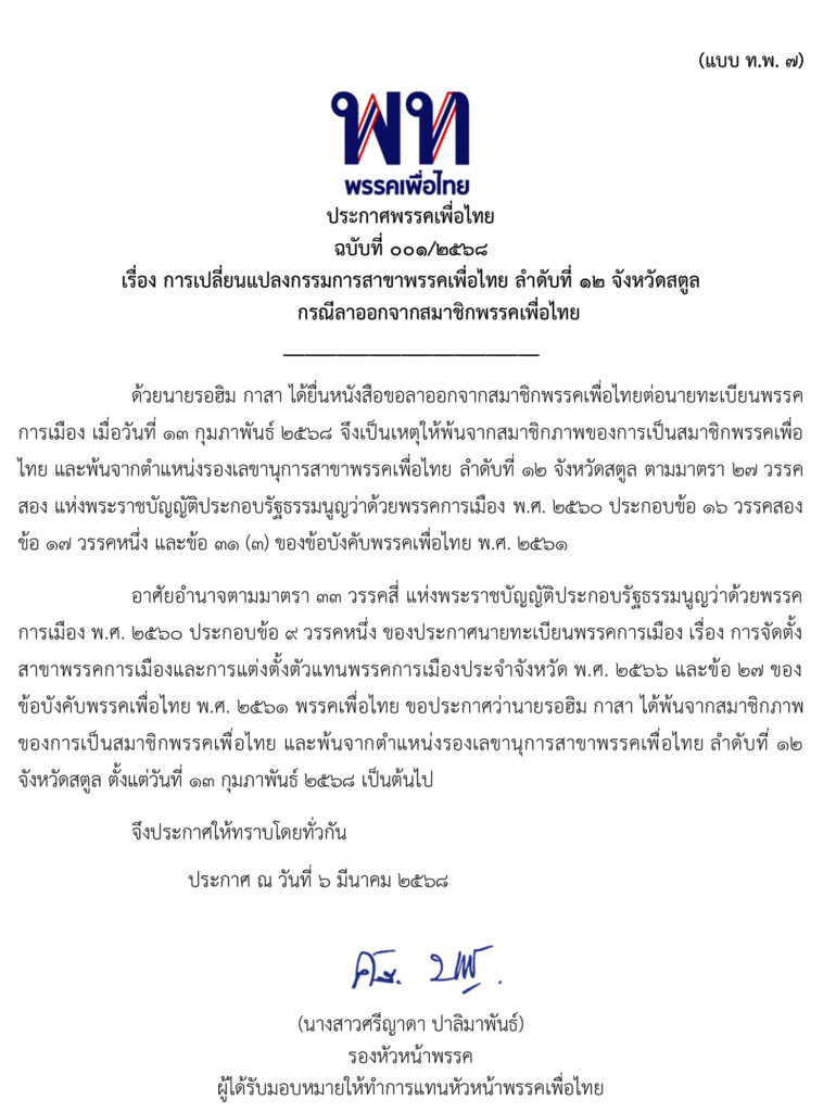 ประกาศพรรคเพื่อไทย ฉบับที่ ๐๐๑-๒๕๖๘ เรื่อง การเปลี่ยนแปลงกรรมการสาขาพรรคเพื่อไทย ลำดับที่ ๑๒ จังหวัดสตูล