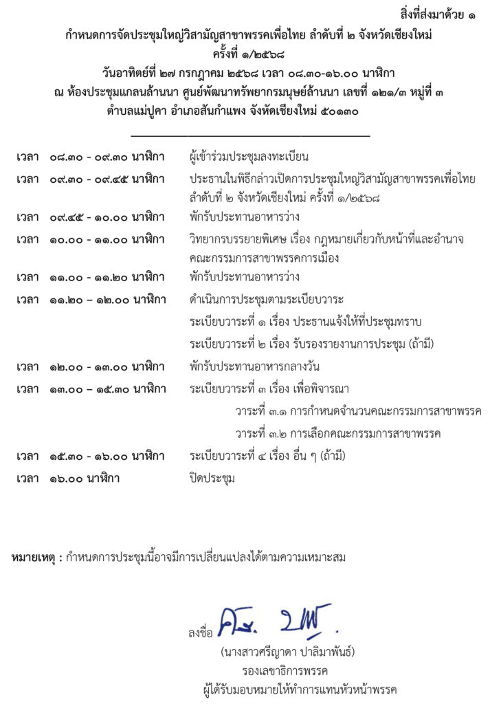 ขอเรียนเชิญสมาชิกพรรคเพื่อไทยที่มีภูมิลำเนาอยู่ในจังหวัดเชียงใหม่เข้าร่วมประชุมใหญ่วิสามัญสาขาพรรคเพื่อไทย ลำดับที่ ๒ จังหวัดเชียงใหม่ ครั้งที่ ๑/๒๕๖๘