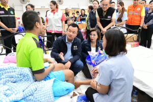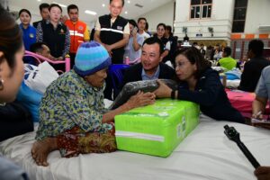 ส่วนจุดที่สาม ได้ลงพื้นที่วิทยาลัยเทคนิคกันทรลักษณ์ ต.จานใหญ่ อ.กันทรลักษณ์ จ.ศรีสะเกษ ที่เป็นศูนย์พักพิงดูแลผู้ป่วยติดเตียงที่อพยพมาช่วงเกิดผลกระทบปัญหาชายแดน ไทย – กัมพูชา ที่อยู่ในความดูแลของแพทย์ พยาบาล ทีมสาธารณสุข และกำลังจะถูกส่งตัวกลับบ้านหลังสถานการณ์เข้าสู่ภาวะปกติ พร้อมมอบสิ่งของ เครื่องอุปโภค บริโภค ให้กำลังใจผู้ป่วย เดินทางกลับบ้านปลอดภัย