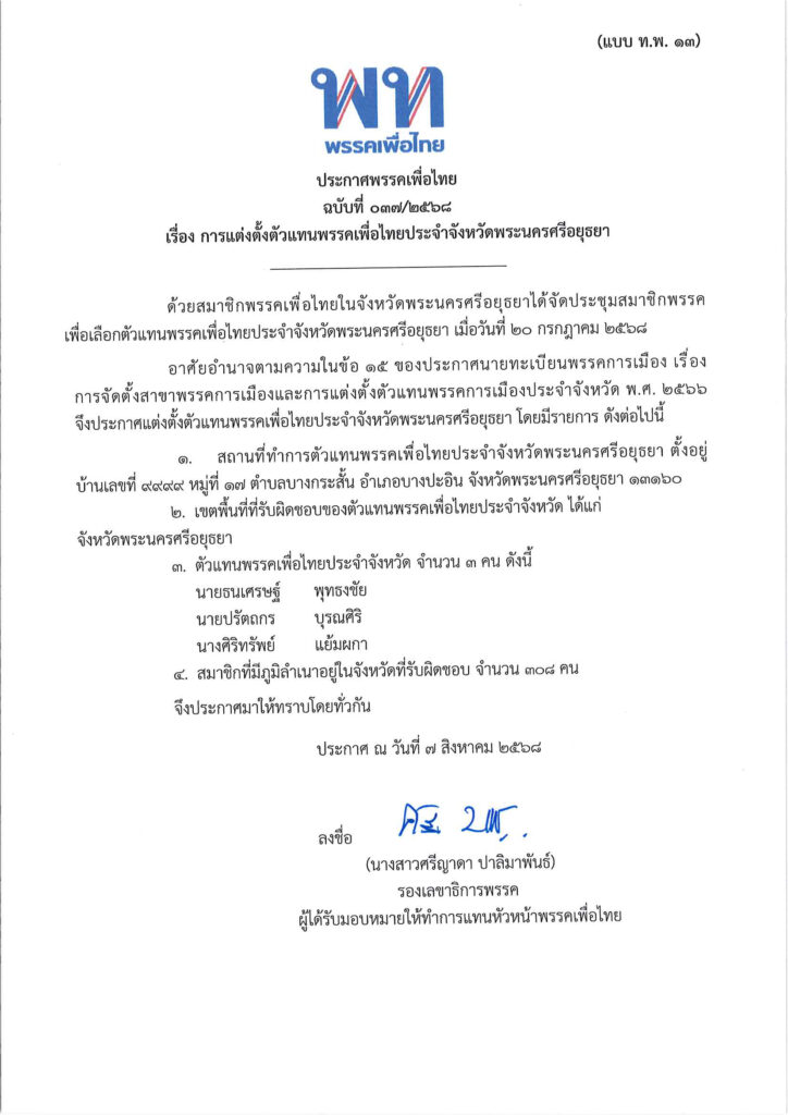 ประกาศพรรคเพื่อไทย ฉบับที่ ๐๓๗/๒๕๖๘ เรื่อง การแต่งตั้งตัวแทนพรรคเพื่อไทยประจำจังหวัดพระนครศรีอยุธยา