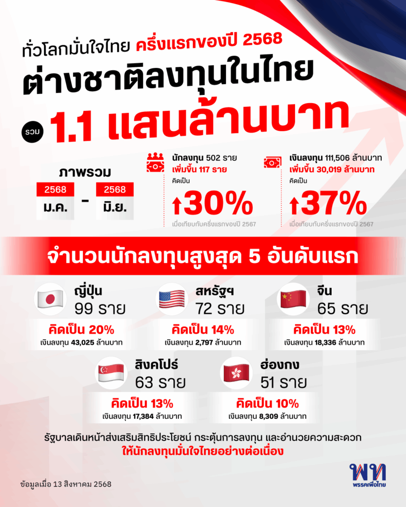 ไทยยังน่าลงทุน หลังพบต่างชาติเชื่อมั่นไทย ครึ่งปีแรกของปี 2568 (ม.ค.-มิ.ย.) ลงทุนในไทย 502 ราย เงินลงทุนรวมทั้งสิ้น 111,506 ล้านบาท