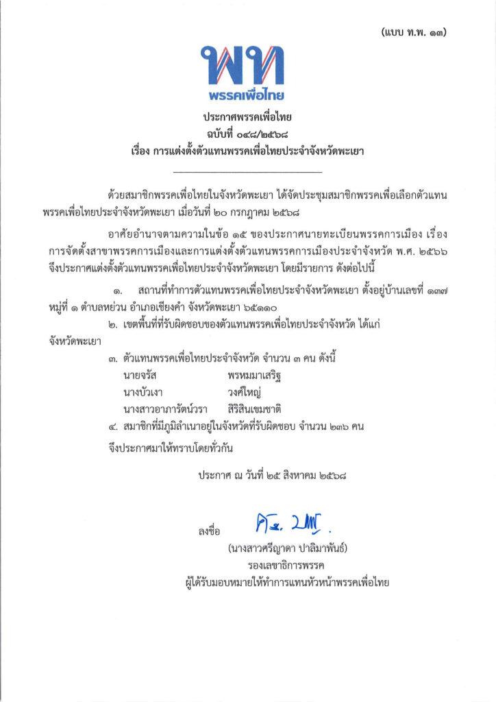 ประกาศพรรคเพื่อไทย ฉบับที่ ๐๔๘/๒๕๖๘ เรื่อง การแต่งตั้งตัวแทนพรรคเพื่อไทยประจำจังหวัดพะเยา