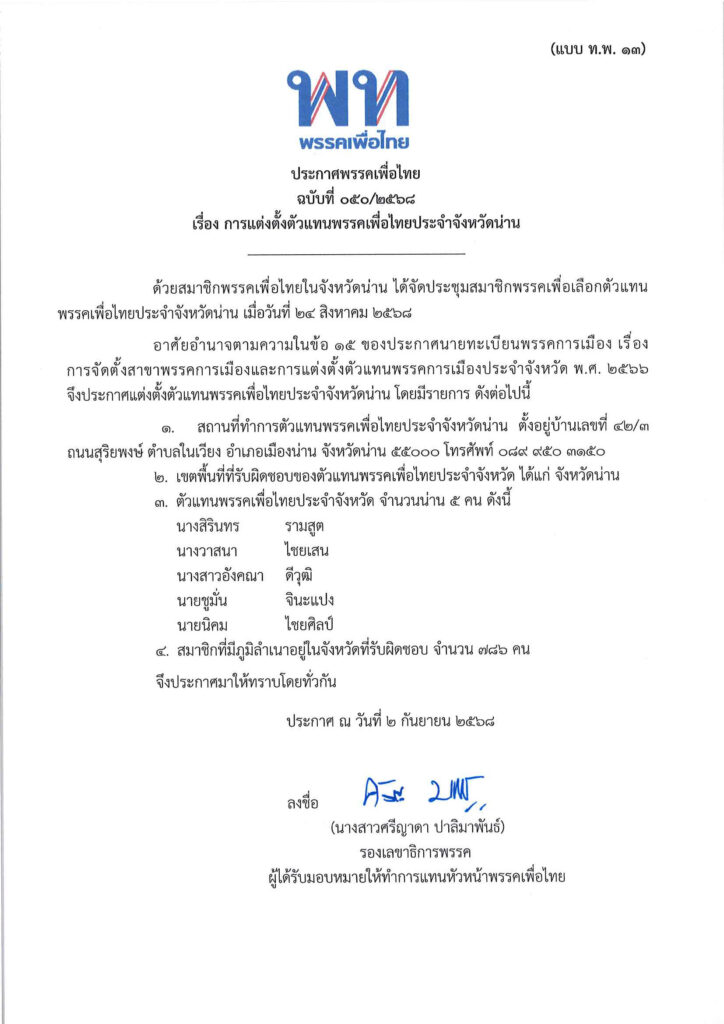 ประกาศพรรคเพื่อไทย ฉบับที่ ๐๕๐/๒๕๖๘ เรื่อง การแต่งตั้งตัวแทนพรรคเพื่อไทยประจำจังหวัดน่าน