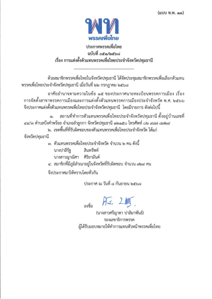ประกาศพรรคเพื่อไทย ฉบับที่ ๐๕๑/๒๕๖๘ เรื่อง การแต่งตั้งตัวแทนพรรคเพื่อไทยประจำจังหวัดปทุมธานี