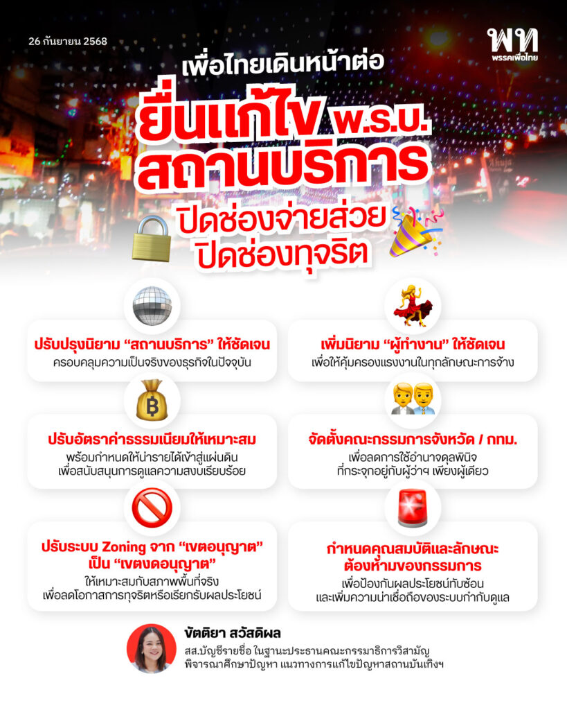‘เพื่อไทย’ เดินหน้ายื่นแก้ไข พ.ร.บ.สถานบริการ ปรับปรุงกฎหมายให้ทันสมัย ปิดช่องจ่ายส่วย-ทุจริต ปลดล็อกศักยภาพภาคเศรษฐกิจกลางคืน