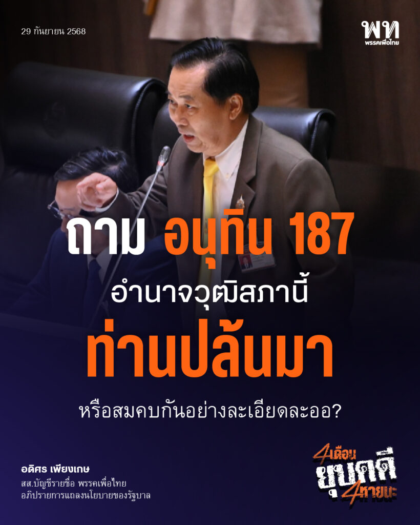 อดิศร เพียงเกษ สส.บัญชีรายชื่อ พรรคเพื่อไทย อภิปรายนโยบายรัฐบาล ระบุว่า สิ่งที่ตนจะพูดต่อไปไม่ได้มีอคติต่อใครทั้งสิ้น และในการแถลงนโยบายต่อรัฐสภา ก็ทราบดีว่า สมควรจะพูดหรือไม่พูดอะไร