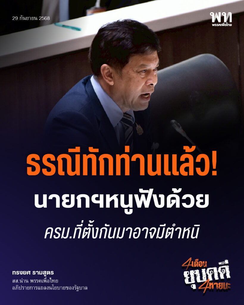 ทรงยศ รามสูตร สส.น่าน เพื่อไทย เปิดอภิปรายนโยบายรัฐบาล เน้นหนักถึงคุณสมบัติรัฐมนตรี โดยเปรียบเปรยกับกรณีแผ่นดินทรุด ว่าเมื่อจิ๊กจกทักยังต้องฟัง นี่ธรณีถึงกับทัก จึงอยากฝากไปถึงครม. ที่นายอนุทิน ชาญวีรกูล นายกรัฐมนตรีตั้งขึ้นมาอาจมีตำหนิ