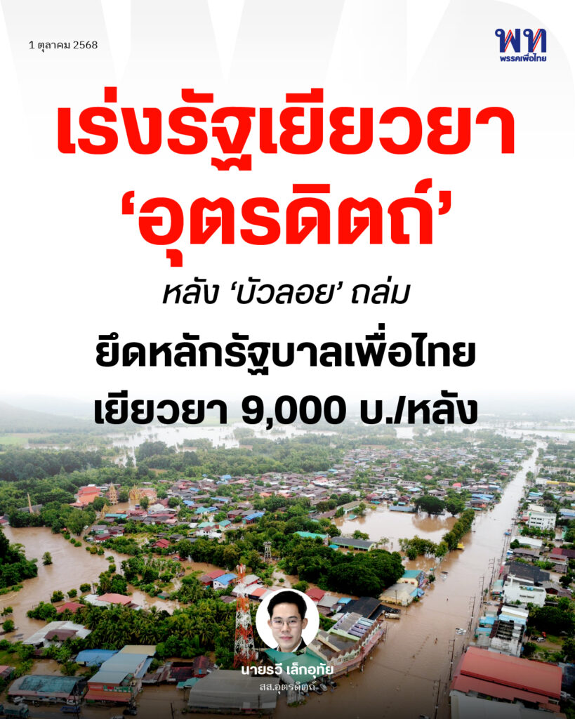 “รวี”ชี้อุตรดิตถ์อ่วม“บัวลอย”แผลงฤทธิ์ทำท่วมหนักหลายอำเภอ เผยชาวบ้านต้องหนีน้ำขึ้นหลังคา“เพื่อไทย”จับมือหน่วยงานรัฐส่งทีมม้าเร็วเร่งช่วยประชาชน