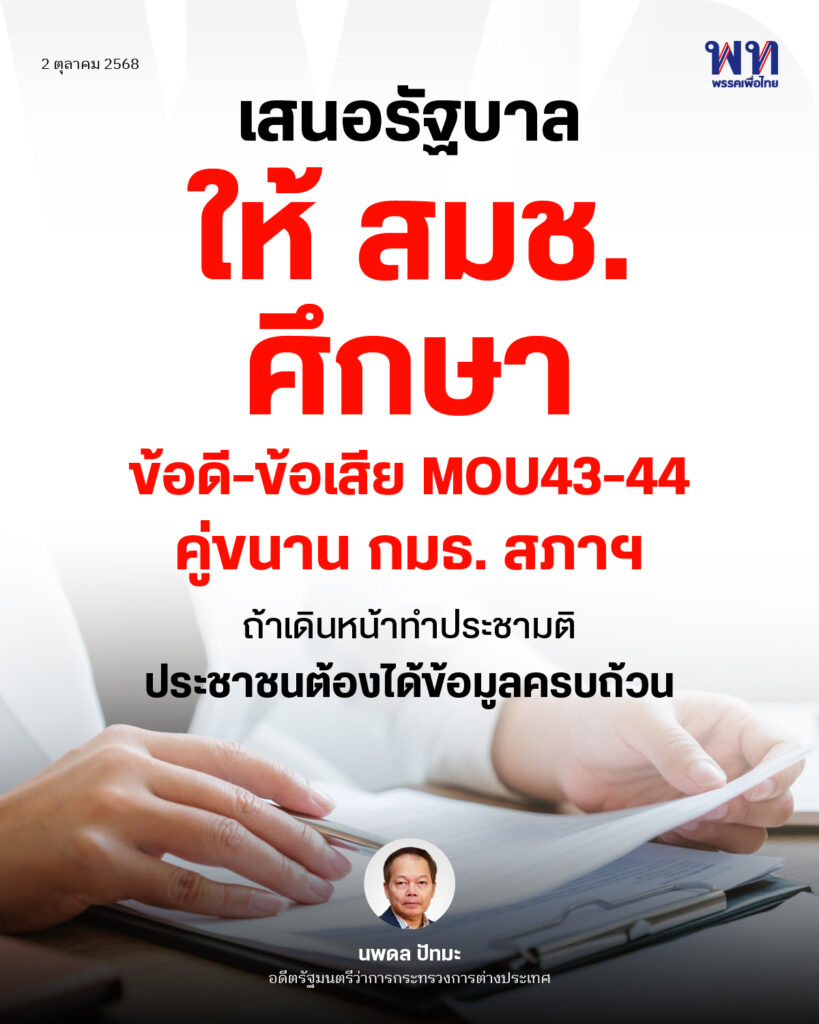 “นพดล” เสนอรัฐบาลมอบสภาความมั่นคงแห่งชาติ (สมช.) ศึกษาข้อดีข้อเสียของเอ็มโอยู 43และ 44 คู่ขนานไปกับคณะ กมธ. ของสภาผู้แทนราษฎร เตือนถ้าเดินหน้าทำประชามติจริงประชาชนต้องได้ข้อมูลครบถ้วน