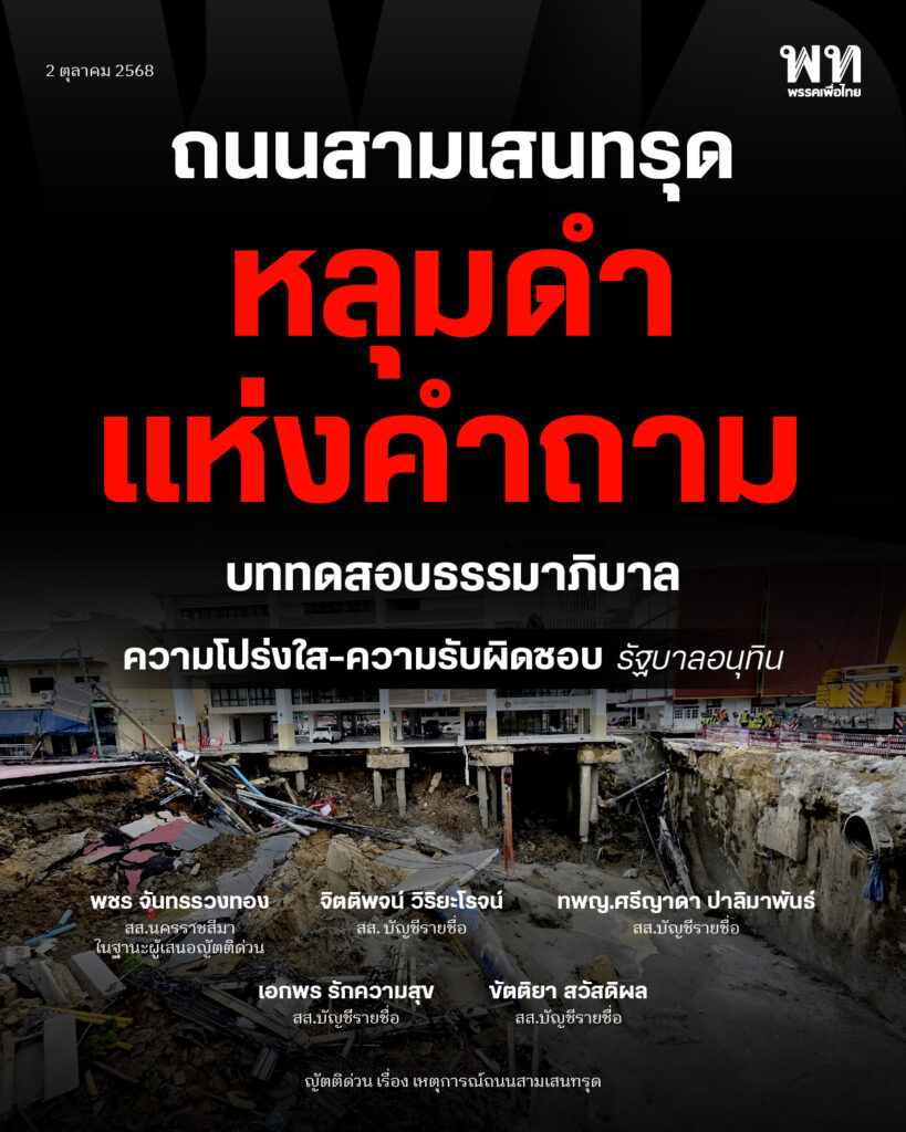 พรรคเพื่อไทย นำโดย นายพชร จันทรรวงทอง สส.นครราชสีมา ในฐานะผู้เสนอญัตติด่วน เรื่อง ขอให้สภาผู้แทนราษฎรติดตามและหาผู้รับผิดชอบกรณีถนนสามเสนยุบตัว โดยขอให้ส่งเรื่องไปยังคณะกรรมาธิการวิสามัญพิจารณาศึกษาการยกระดับมาตรฐานการก่อสร้าง มาตรฐานความปลอดภัย การเยียวยาผู้ได้รับผลกระทบ และการพัฒนาศักยภาพอุตสาหกรรมรับเหมาก่อสร้างอย่างเป็นระบบ พร้อมด้วย นายจิตติพจน์ วิริยะโรจน์ สส. บัญชีรายชื่อ ทพญ.ศรีญาดา ปาลิมาพันธ์ สส.บัญชีรายชื่อ นายเอกพร รักความสุข สส.บัญชีรายชื่อ และ นางสาวขัตติยา สวัสดิผล สส.บัญชีรายชื่อ ร่วมอภิปราย