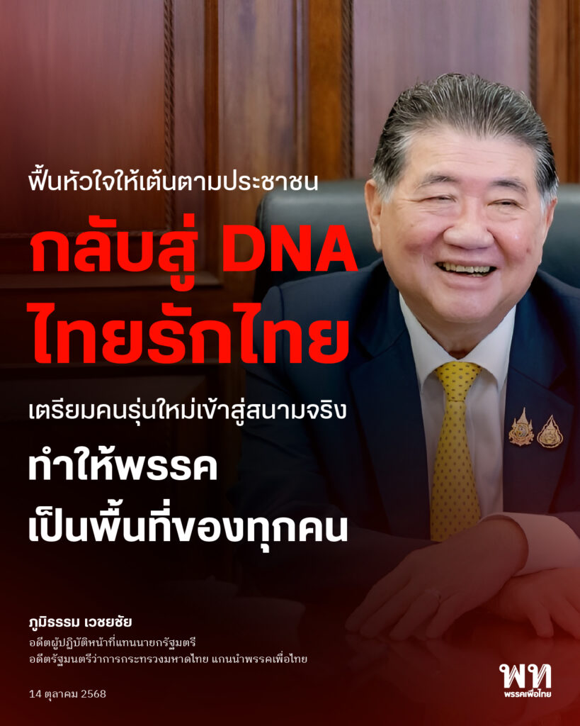 ‘ภูมิธรรม’ ย้ำยกเครื่องเพื่อไทย ไม่ใช่เพียงเปลี่ยนโครงสร้างพรรค แต่ต้องฟื้นหัวใจพรรคให้เต้นตามจังหวะประชาชน ยันช่วงเวลาเปลี่ยนผ่านนี้ เพื่อไทยต้องกลับสู่ DNA ไทยรักไทย ใช้ข้อมู งานวิจัยเคลื่อนนโยบาย เปิดรับคนรุ่นใหม่ พร้อมพัฒนา ไม่หยุดนิ่ง ไม่ยึดติดอดีต
