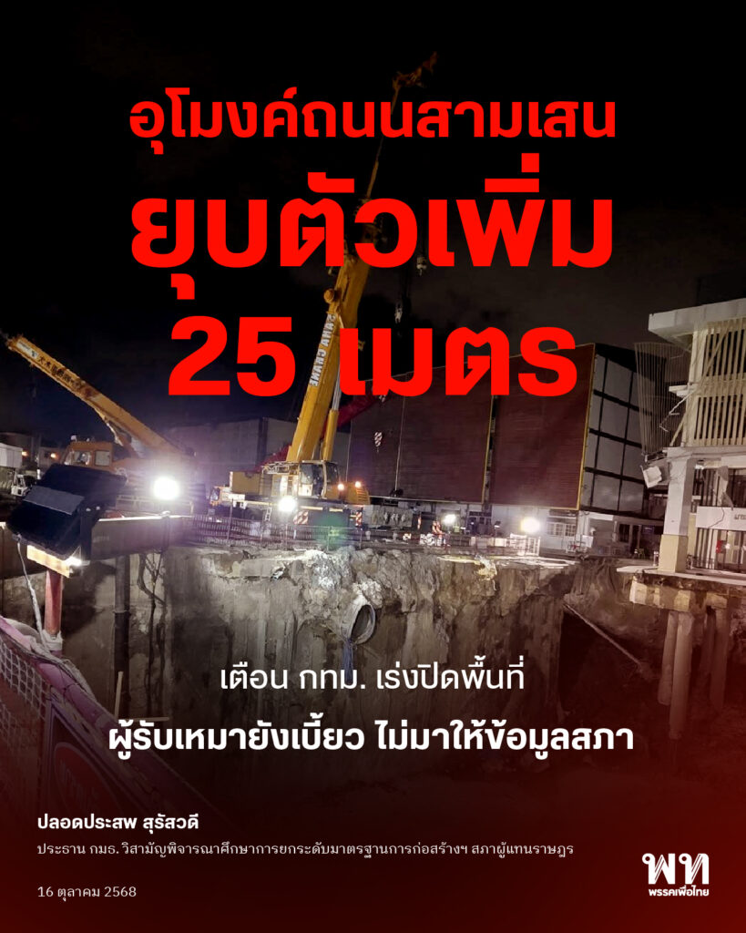 วิทยุรัฐสภารายงานว่าเมื่อวันที่ 15 ต.ค.2568 นายปลอดประสพ สุรัสวดี ประธานคณะกรรมาธิการ (กมธ.) วิสามัญพิจารณาศึกษาการยกระดับมาตรฐานการก่อสร้าง มาตรฐานความปลอดภัย การเยียวยาผู้ได้รับผลกระทบ และการพัฒนาศักยภาพอุตสาหกรรมรับเหมาก่อสร้างอย่างเป็นระบบ สภาผู้แทนราษฎร แถลงข่าวผลการพิจารณากรณีถนนสามเสน บริเวณพื้นที่ก่อสร้างโครงการรถไฟฟ้าสายสีม่วง ช่วงเตาปูน–ราษฎร์บูรณะ (วงแหวนกาญจนาภิเษก) หน้าโรงพยาบาลวชิรพยาบาล เกิดการทรุดตัว ว่า ตลอดระยะเวลา 3 สัปดาห์ที่ผ่านมา คณะกมธ.ได้สืบหาข้อเท็จจริงเกี่ยวกับเรื่องนี้ พบข้อมูลทางเทคนิคชัดเจนว่ามี เกิดการยุบตัวเพิ่มขึ้นอย่างต่อเนื่อง โดยมีการเคลื่อนตัวของอุโมงค์ทั้งสองข้างไปทางทิศตะวันออก ระยะทางประมาณ 25 เมตร จึงส่งผลให้พื้นที่เหนืออุโมงค์ดังกล่าวมีความเสี่ยงสูง หากประชาชนสัญจรผ่านไม่ว่าจะเดินหรือขับรถอาจเกิดการทรุดตัวและอุบัติเหตุร้ายแรงถึงชีวิตได้ พร้อมเตือนให้กรุงเทพมหานคร (กทม.) เร่งแจ้งเตือนและปิดพื้นที่โดยด่วน เนื่องจากสภาพอากาศในช่วงนี้มีฝนตกต่อเนื่องจึงอาจเร่งให้ดินและน้ำผสมกันจนเกิดการถล่มได้