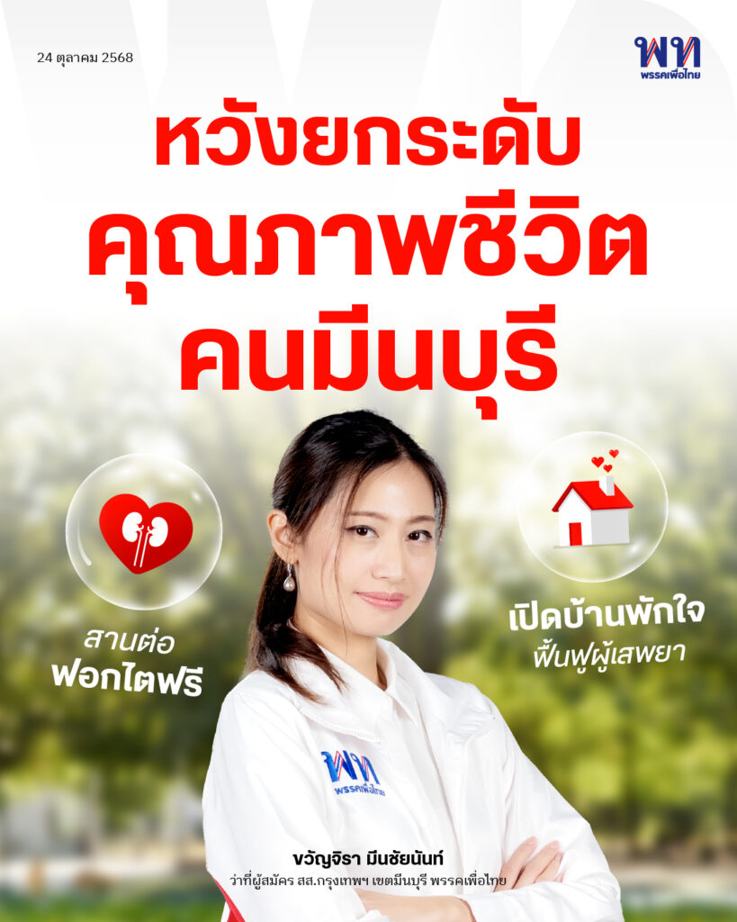 ‘ขวัญจิรา’ หวังผลักดันนโยบายยกระดับคุณภาพชีวิตคนมีนบุรี ‘เพื่อไทย’ พร้อมต่อยอดบัตรทองบริการฟอกไตฟรี เปิดบ้านพักใจฟื้นฟูผู้เสพยา