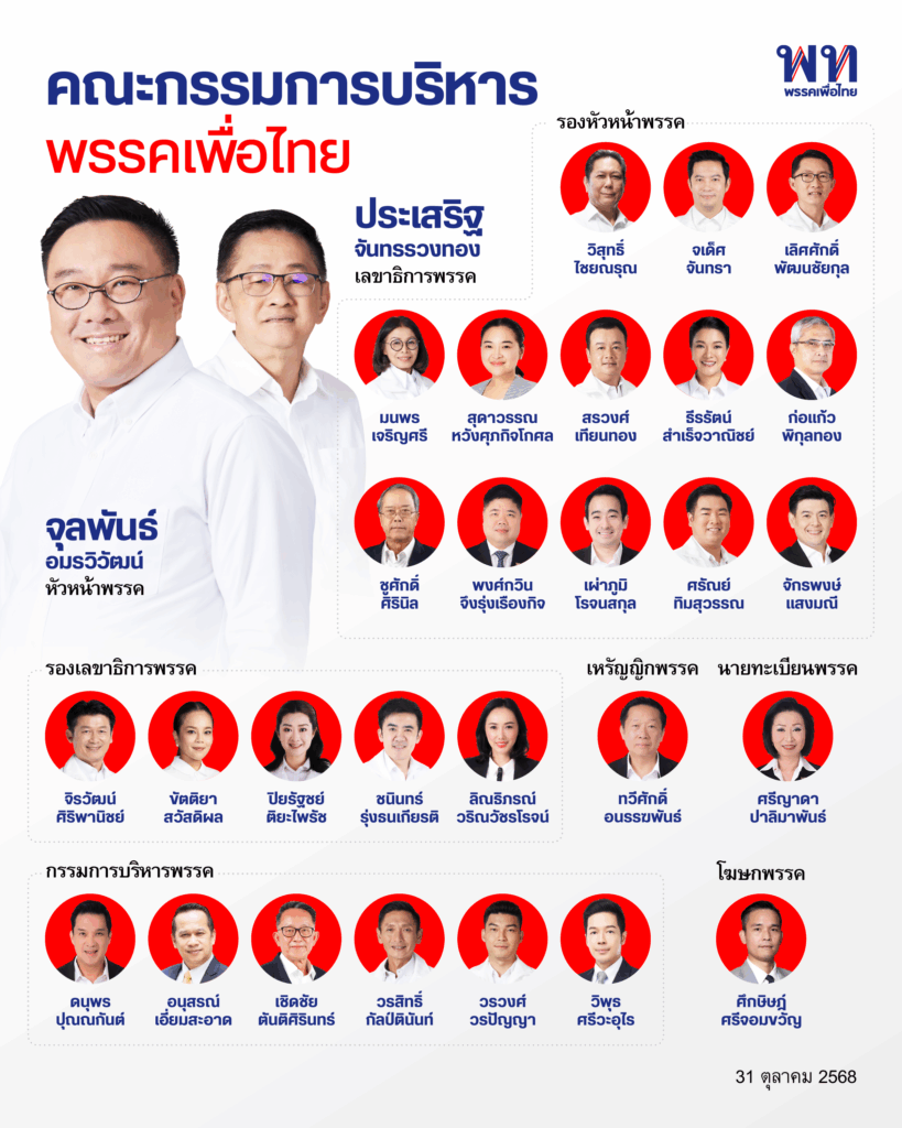 เผยโฉมคณะกรรมการบริหารพรรคเพื่อไทยชุดใหม่ 29 คน