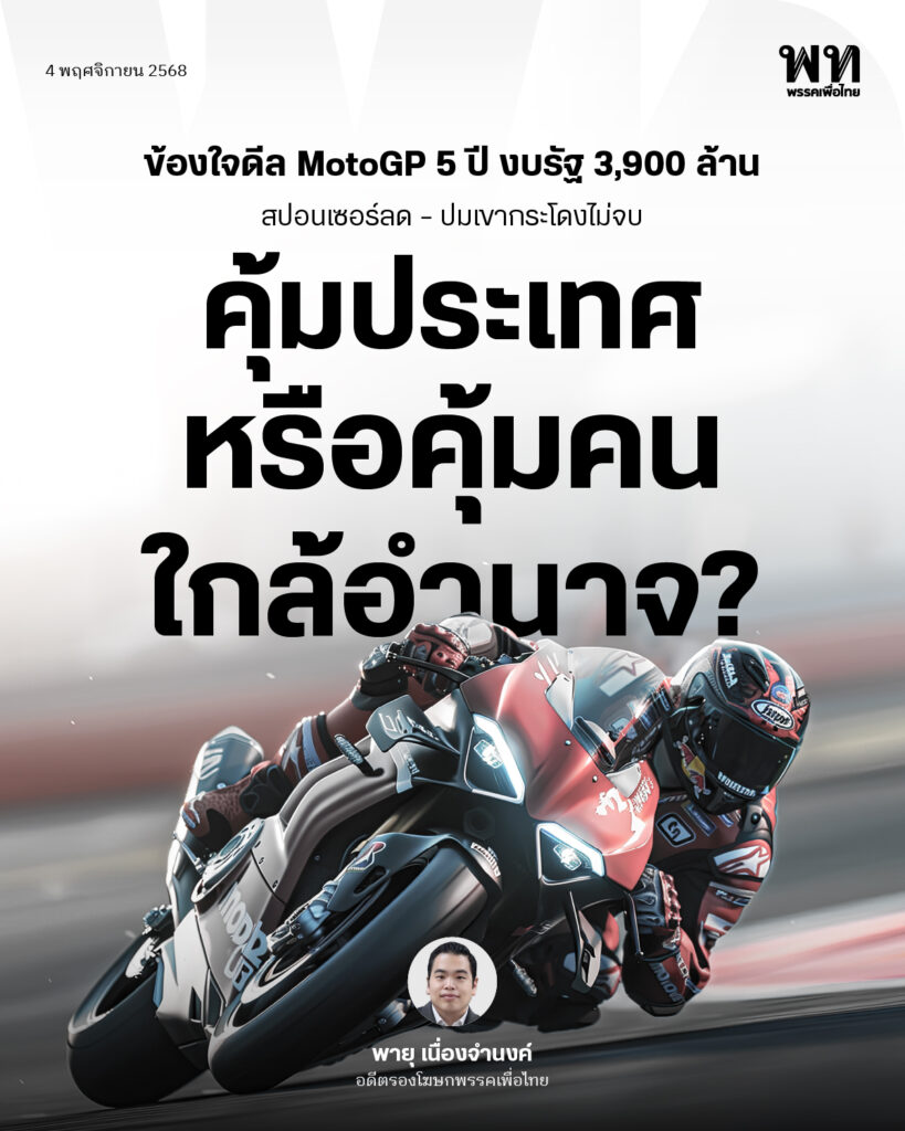 สุดท้าย พายุย้ำว่า ความเร่งรีบในการต่อสัญญา โดยไม่เปิดเผยรายละเอียดหรือแผนบริหารความเสี่ยง สะท้อนความขาดรอบคอบในการตัดสินใจทางนโยบาย เช่นเดียวกับกรณี MOU แร่แรร์เอิร์ธ ที่รัฐบาลเร่งเซ็นโดยขาดความโปร่งใสในกระบวนการเจรจา หากรัฐบาลต้องการผลักดันให้ MotoGP อยู่ในไทยจริง ก็ควรทำให้ถูกทาง เอกชนที่ได้รับประโยชน์ควรแสดงสปิริตลงทุนอย่างเป็นธรรม และรัฐต้องเปิดเผยข้อมูลสาธารณะทุกขั้นตอน เพื่อให้ประชาชนมั่นใจว่า ประเทศไทยจัดงานระดับโลก อย่างคุ้มค่าโดยไม่ต้องจ่ายราคาแพงเกินจริงเพียงเพื่อประโยชน์กับคนกลุ่มน้อยอีก