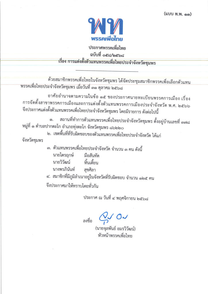 ประกาศพรรคเพื่อไทย ฉบับที่ ๐๕๘-๒๕๖๘ เรื่อง เรื่อง การแต่งตั้งตัวแทนพรรคเพื่อไทยประจำจังหวัดชุมพร