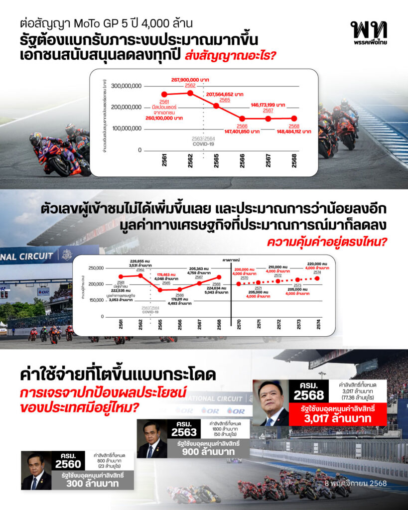 โฆษกจอม ข้องใจ มติ ครม. ต่อสัญญา MotoGP 5 ปี งบรัฐพุ่งเกือบ 4 พันล้าน ทั้งที่ตัวเลขผู้ชม–ผลตอบแทนเศรษฐกิจลดลง เอกชนถอนตัวต่อเนื่อง เพื่อไทยถามชัด “คุ้มประเทศ หรือคุ้มใคร? หวังใช้ที่ดินเขากระโดงตัวประกันหรือไม่
