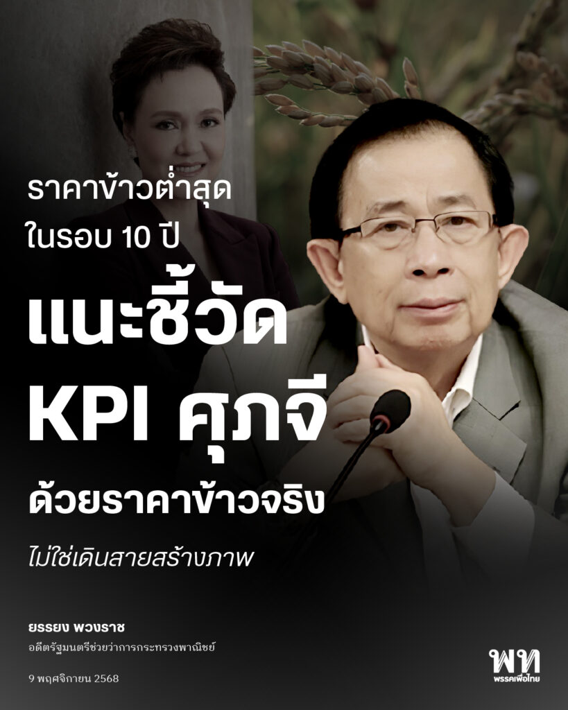 “ยรรยง” จี้รัฐบาลเร่งแก้ราคาข้าวต่ำ ชาวนาโอดแย่สุดในรอบ 10 ปี – ตาม “รมว.พาณิชย์” หยุดเดินสายสร้างภาพ หวังเห็นสัญญาจีนซื้อ-ขายข้าวจริง – แนะนายกฯ ตั้ง KPI “ศุภจี” วัดความสำเร็จราคาข้าว
