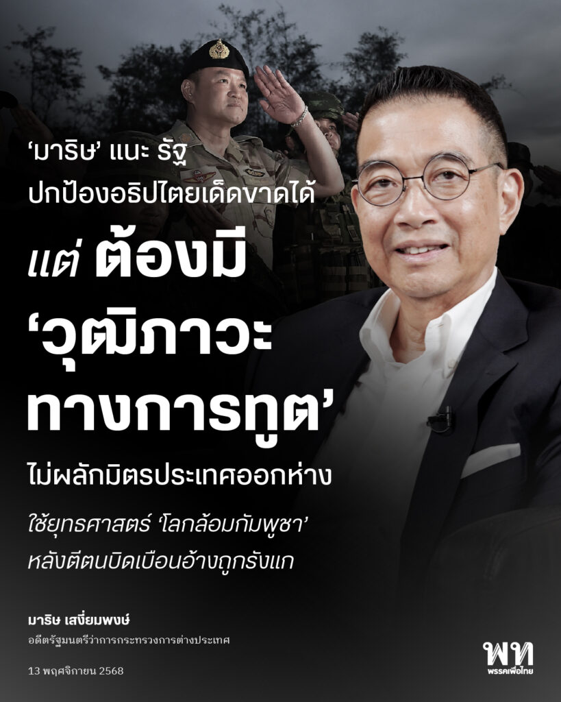 “มาริษ” ห่วงท่าทีแข็งกร้าว “อนุทิน” กรณีกัมพูชา แนะใช้ “วุฒิภาวะทางการทูต” เปลี่ยนเกมกลับเป็น “โลกล้อมกัมพูชา”