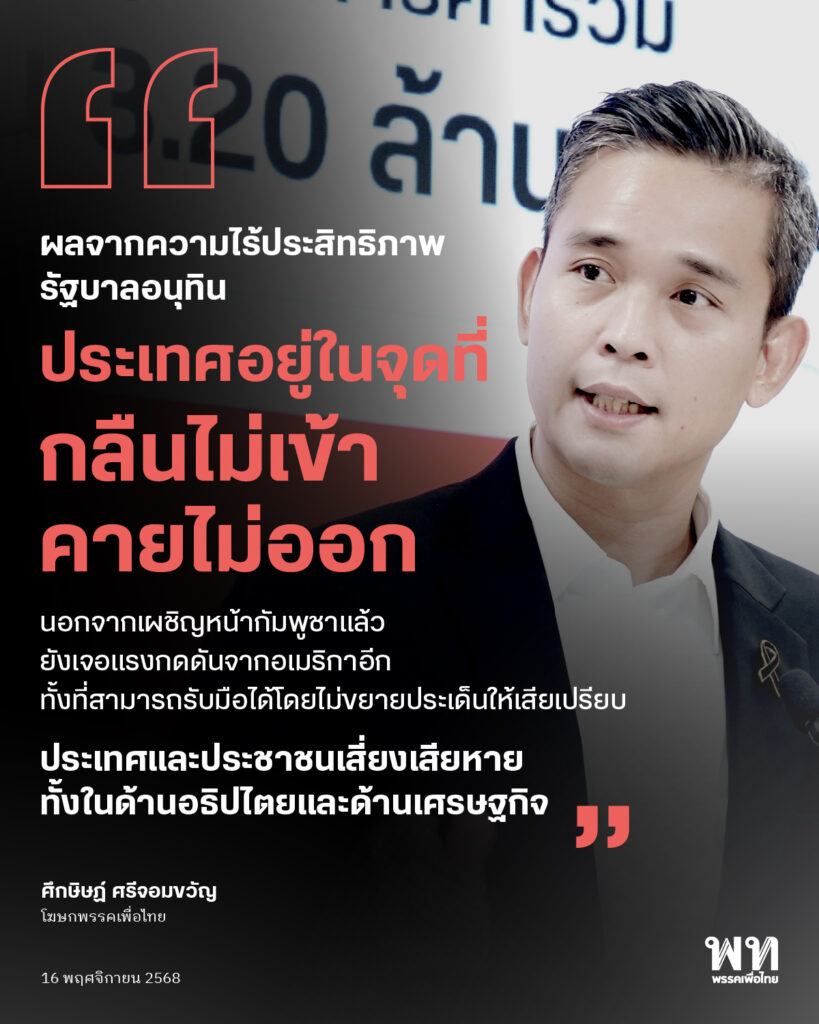 “ผลลัพธ์จากการบริหารงานไร้ประสิทธิภาพ ทำให้ประเทศอยู่ในจุดที่กลืนไม่เข้าคลายไม่ออก นอกจากเผชิญหน้ากัมพูชาแล้ว ยังเจอกับแรงกดดันจากอเมริกาอีกด้วย ทั้งที่สามารถรับมือสถานการณ์ได้ดีกว่านี้โดยไม่ขยายประเด็นเปิดช่องให้ตกเป็นฝ่ายเสียเปรียบ ถึงแม้ว่าเราจะไม่พอใจกับท่าทีของสหรัฐอย่างไรก็ตาม ข้อเท็จจริงคือมูลค่าการค้าขายกว่า 3 ล้านล้านบาท ภายใต้ตัวเลขเหล่านี้คือพี่น้องประชาชนจำนวนหลายสิบล้านคนที่จะได้รับผลกระทบ เสียหายทั้งในด้านอธิปไตยและด้านเศรษฐกิจ