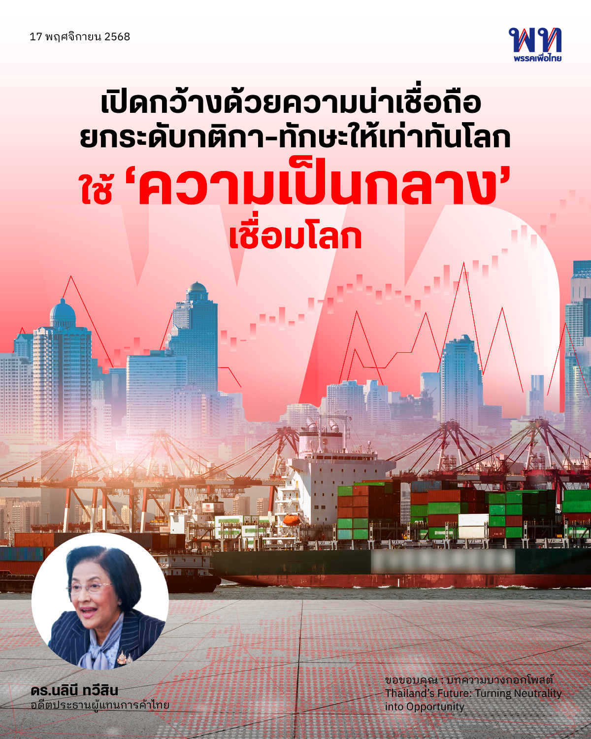 บทความ “อนาคตของประเทศไทย: เปลี่ยนความเป็นกลางเป็นโอกาส” โดย ดร.นลินี ทวีสิน อดีตประธานผู้แทนการค้าไทย ตีพิมพ์ใน บางกอกโพสต์ กล่าวถึงแนวทางเชิงยุทธศาสตร์ที่ประเทศไทยควรใช้ในยุคโลกหลายขั้ว เพื่อเปลี่ยน “ความเป็นกลางทางการเมือง” ให้กลายเป็น “สินทรัพย์ทางเศรษฐกิจ” ที่สร้างความเชื่อมั่นและดึงดูดพันธมิตรทั่วโลก