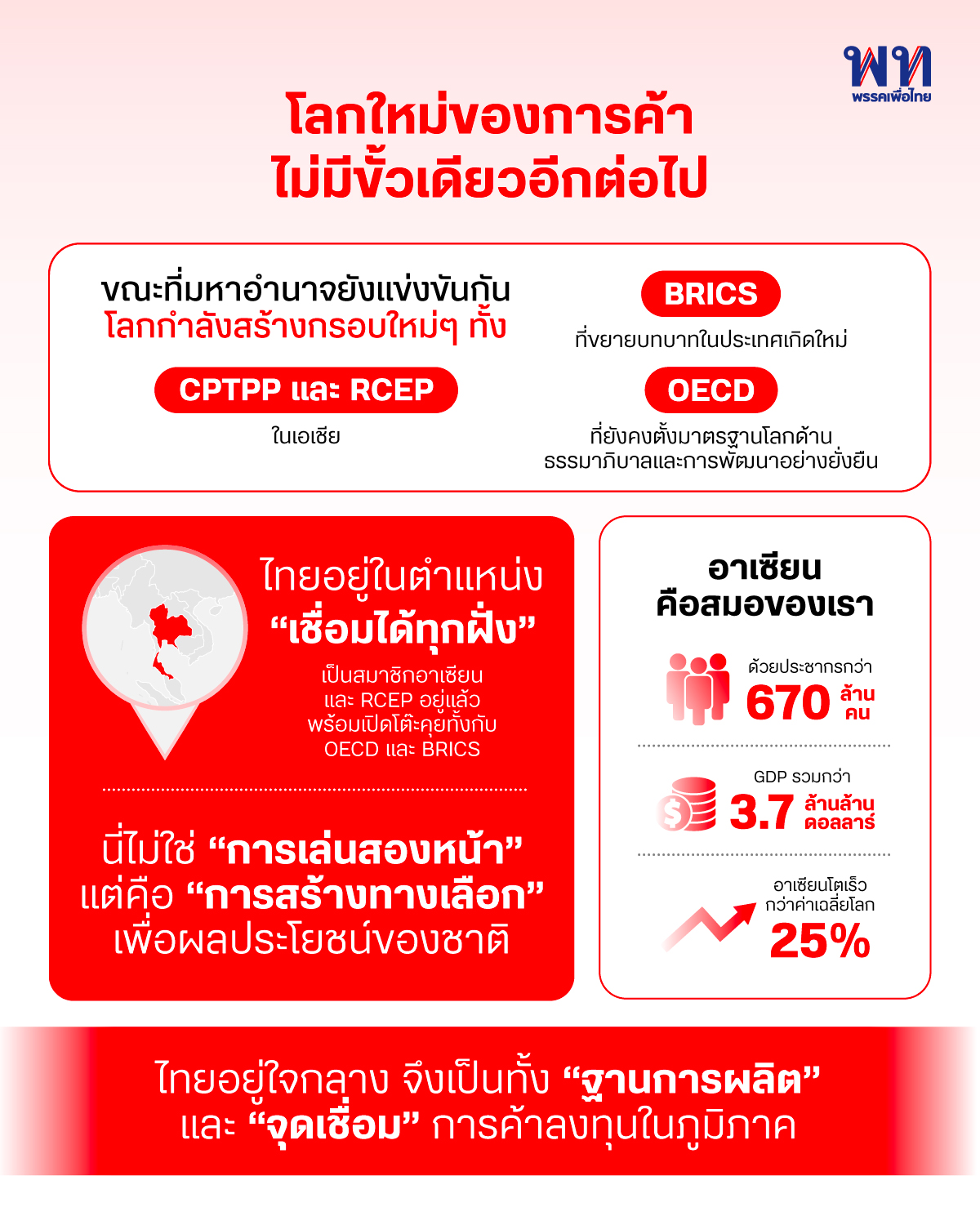 ในบริบทนี้ อาเซียน ยังคงเป็น “เสาหลัก” ทางเศรษฐกิจ ด้วยประชากรกว่า 670 ล้านคน และ GDP รวม 3.7 ล้านล้านดอลลาร์สหรัฐ ซึ่งเติบโตเร็วกว่าค่าเฉลี่ยโลกถึง 25% — ส่งผลให้ประเทศไทยอยู่ในจุดที่สามารถเป็น “ศูนย์กลางของอาเซียนและสะพานเชื่อมเศรษฐกิจโลก” ได้อย่างมั่นคง