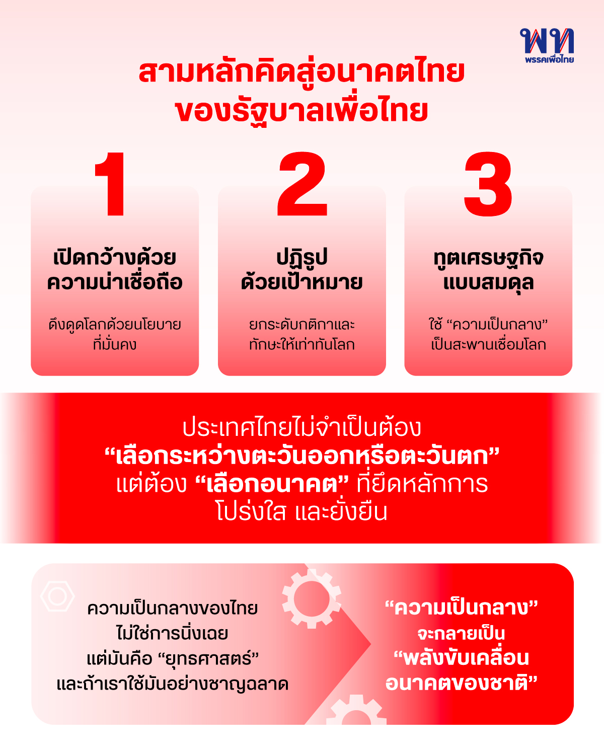 “ความเป็นกลางของไทยไม่ใช่การอยู่เฉย แต่คือการริเริ่ม” — หมายถึงการเปิดกว้างในการร่วมมือกับทุกฝ่าย ขณะเดียวกันก็ยึดมั่นในผลประโยชน์ของชาติ