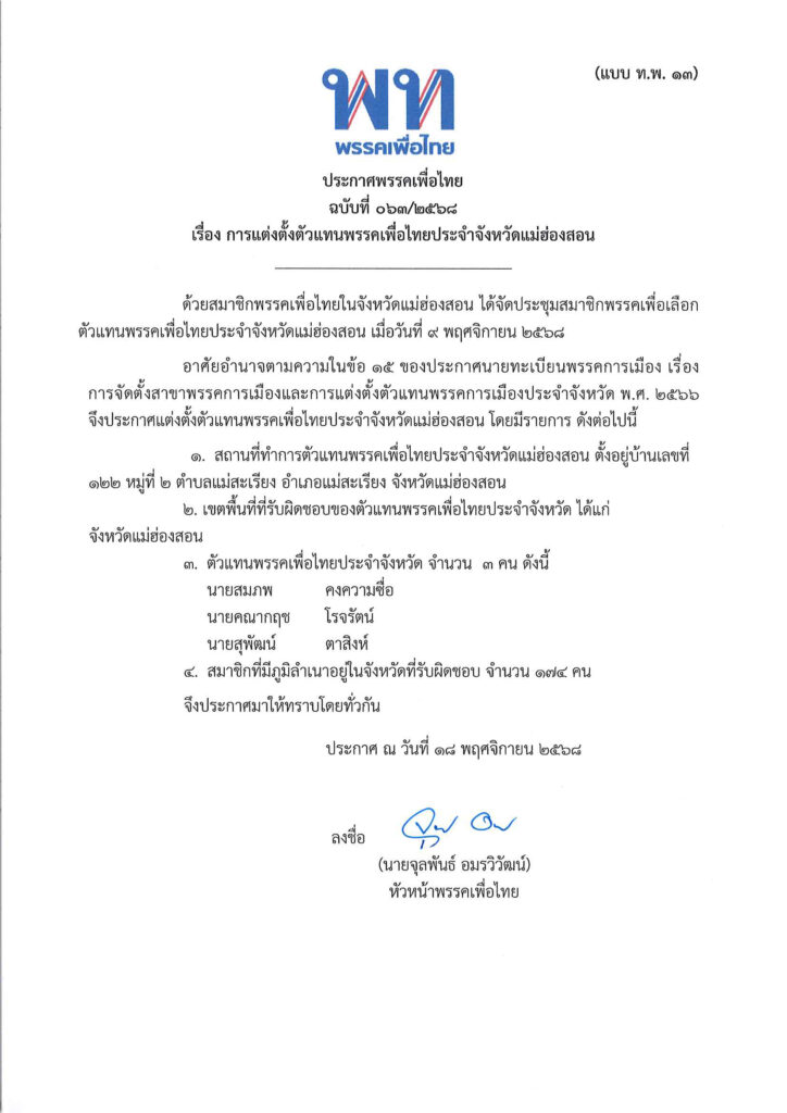 ประกาศพรรคเพื่อไทย ฉบับที่ ๐๖๓-๒๕๖๘ เรื่อง การเปลี่ยนแปลงตัวแทนพรรคเพื่อไทยประจำจังหวัดแม่ฮ่องสอน