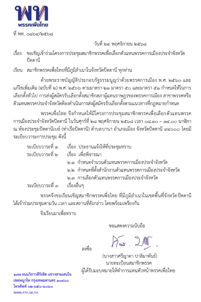 ขอเชิญเข้าร่วมโครงการประชุมสมาชิกพรรคเพื่อเลือกตัวแทนพรรคการเมืองประจำจังหวัดปัตตานี