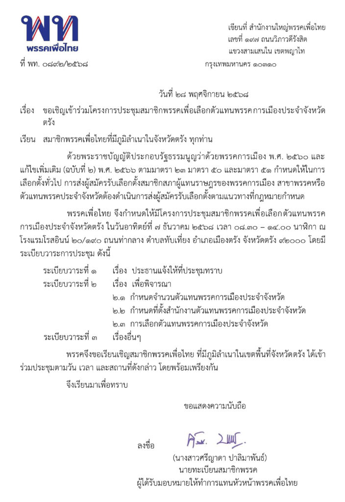 ขอเชิญเข้าร่วมโครงการประชุมสมาชิกพรรคเพื่อเลือกตัวแทนพรรคการเมืองประจำจังหวัดตรัง