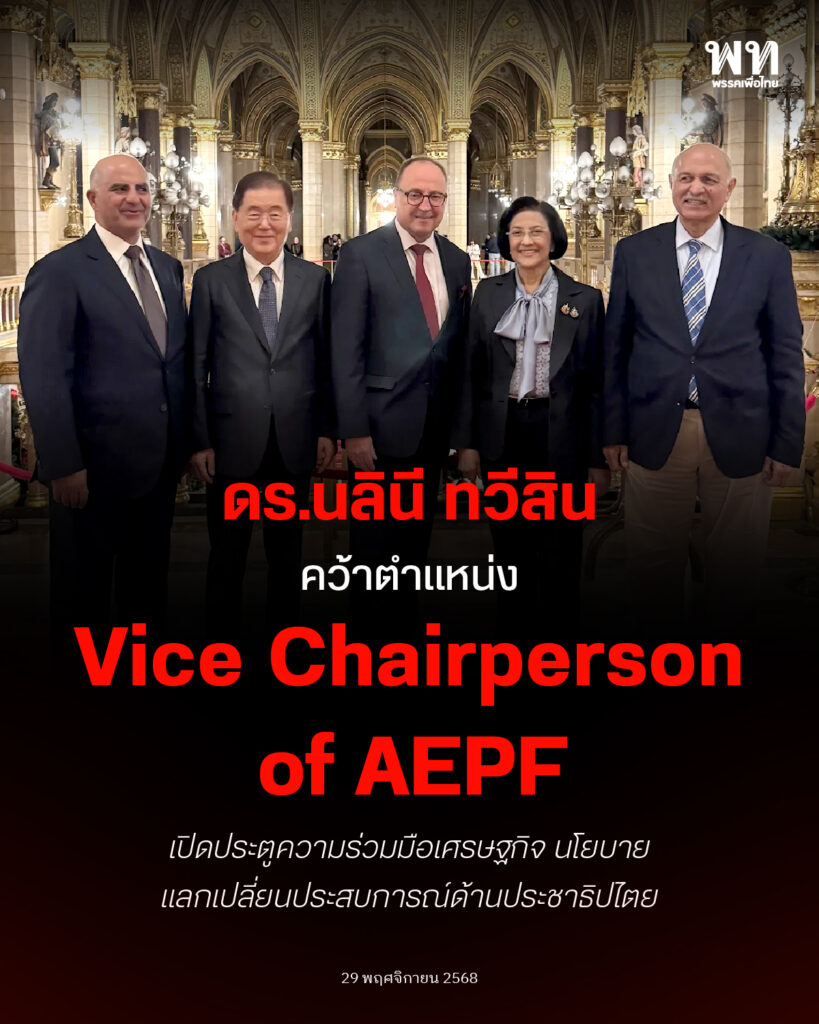 ดร.นลินี ทวีสิน ผู้แทนจากพรรคเพื่อไทย และอดีตประธานผู้แทนการค้าไทย ได้รับการคัดเลือกให้ดำรงตำแหน่ง Vice Chairperson of the AEPF ในการประชุมเวทีความร่วมมือทางการเมืองเอเชีย–ยุโรป หรือ Asia-Europe Political Forum (AEPF) ครั้งที่ 6 ซึ่งจัดขึ้นระหว่างวันที่ 27–29 พฤศจิกายน 2568 ที่เมืองบูดาเปสต์ ประเทศฮังการี ได้สร้างหมุดหมายสำคัญให้กับประเทศไทย ท่ามกลางการเข้าร่วมของพรรคการเมืองกว่า 30 พรรค จากทั้งเอเชียและยุโรป