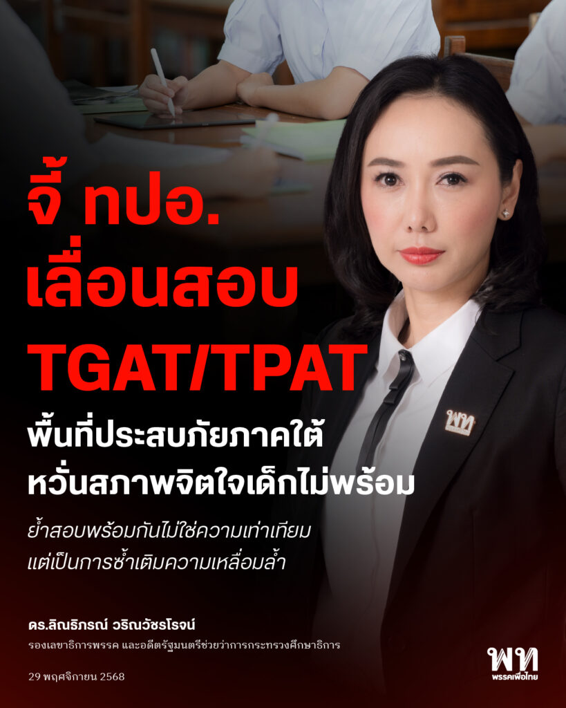 ‘ดร.ลิณธิภรณ์’ จี้ ทปอ. เลื่อนสอบ TGAT/TPAT พื้นที่ประสบภัยภาคใต้ หวั่นสภาพจิตใจเด็กไม่พร้อม ย้ำสอบพร้อมกันไม่ใช่ความเท่าเทียม แต่เป็นการซ้ำเติมความเหลื่อมล้ำ