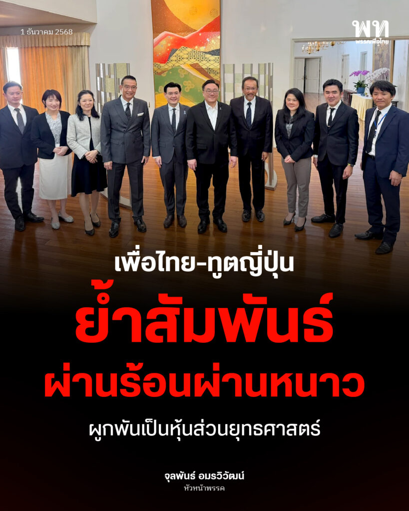 เพื่อไทย-ทูตญี่ปุ่น ย้ำสัมพันธ์ผ่านร้อนผ่านหนาว ผูกพันเป็นหุ้นส่วนยุทธศาสตร์ เพิ่มลงทุนโครงสร้างพื้นฐานในไทย