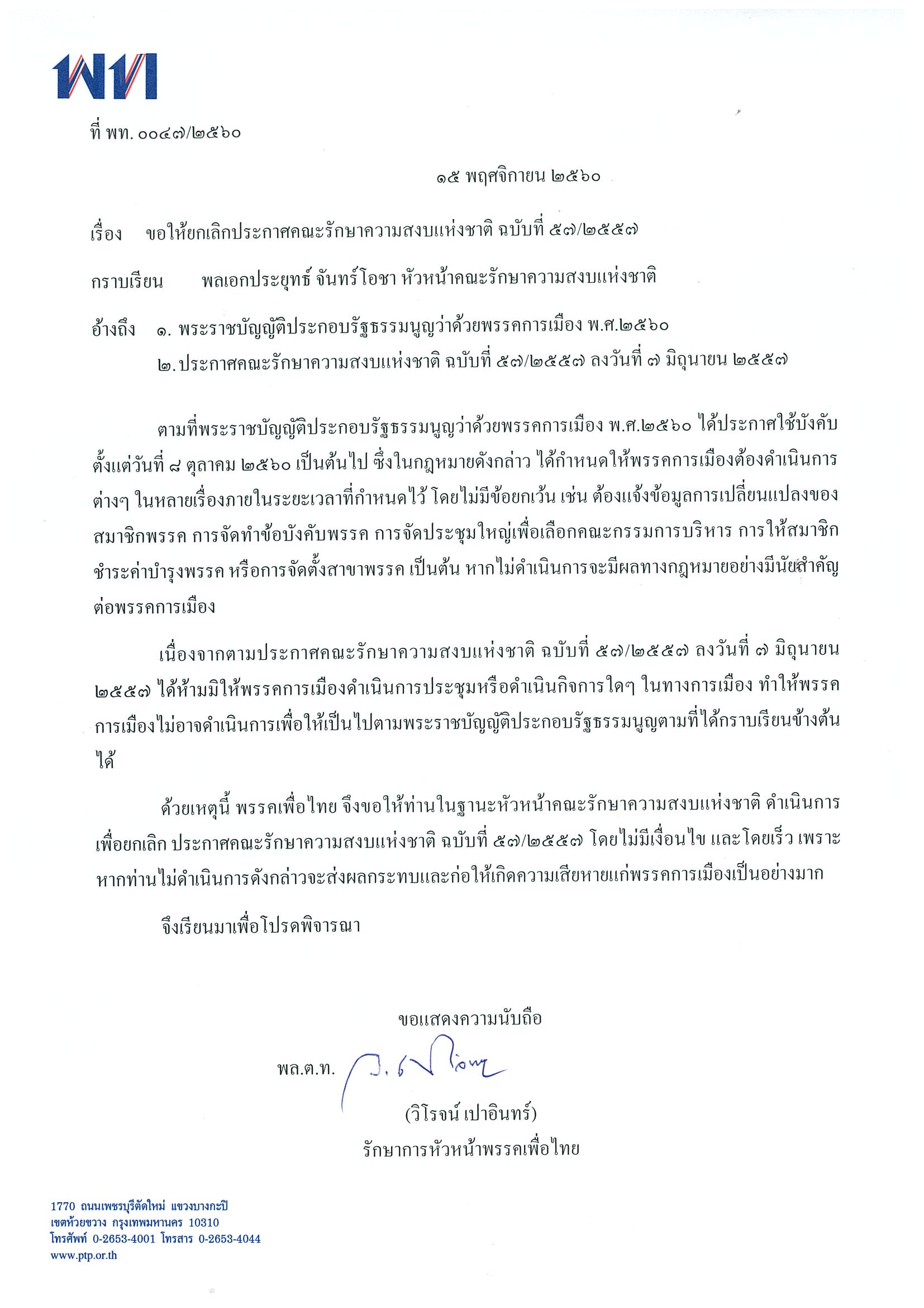 “เพื่อไทย” ส่งจม.ถึงนายกฯประยุทธ์ ชี้ควรยกเลิกคำสั่งห้ามกิจการทางการเมือง