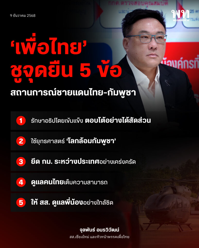 ‘จุลพันธ์ ’ แถลง พรรคเพื่อไทยแสดงจุดยืน 5 ข้อ เร่งรัฐบาลคุมสถานการณ์ชายแดนไทย-กัมพูชารักษาอธิปไตยเข้มแข็ง, ใช้มาตรการ ‘โลกล้อมกัมพูชา’ ยึดกรอบกฎหมายระหว่างประเทศให้ชัด และดูแลพี่น้องคนไทยทุกคนให้ปลอดภัย