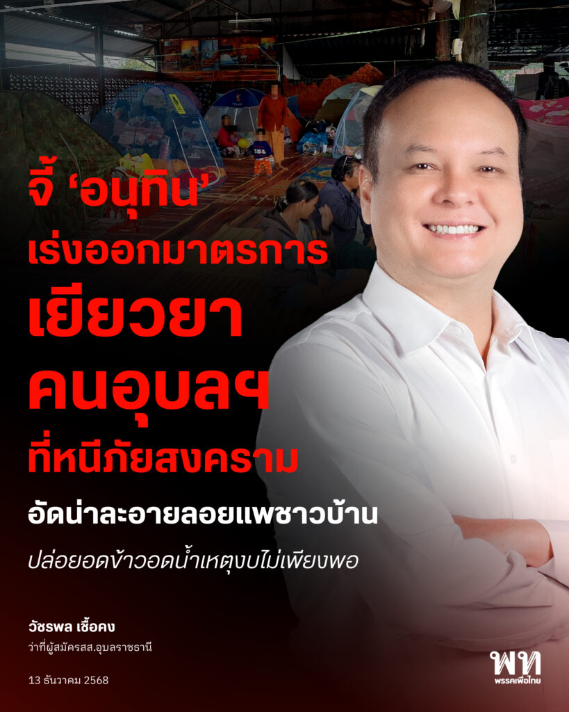 ‘วัชรพล’ จี้ ‘อนุทิน’ เร่งออกมาตรการเยียวยาคนอุบลฯ ที่หนีภัยสงคราม อัดน่าละอายลอยแพชาวบ้าน ปล่อยอดข้าวอดน้ำเหตุงบไม่เพียงพอ