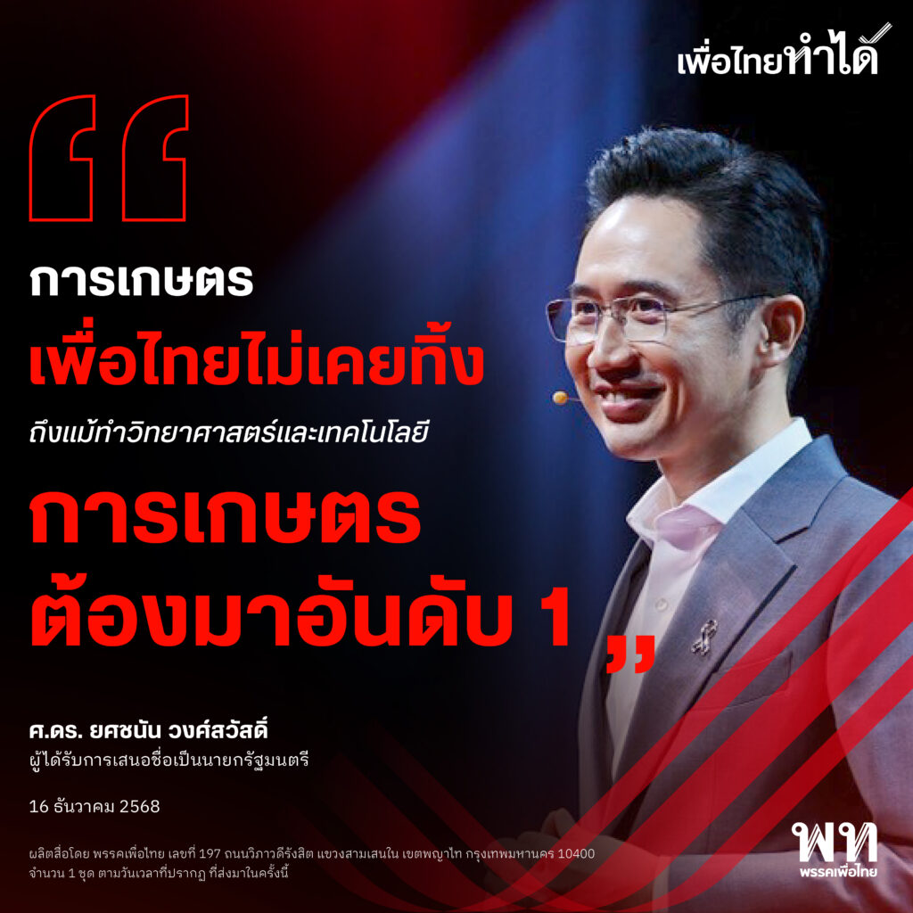 ยศชนันยกตัวอย่างภาคเกษตรกรรม และย้ำว่าพรรคเพื่อไทยไม่เคยทิ้งภาคการเกษตร ในการพัฒนาด้วยวิทยาศาสตร์และเทคโนโลยี การเกษตรต้องมาเป็นอันดับ 1 พร้อมยกตัวอย่างว่าภาคการวิจัย คนไทย นักวิจัยไทยมีความสามารถและความรู้ พร้อมที่จะให้ความร่วมมือ รวมถึงแสดงวิสัยทัศน์ในการสร้างความร่วมมือจากรัฐ ส่งเสริมสตาร์ทอัพและคนรุ่นใหม่ให้ก้าวไปในระดับโลก