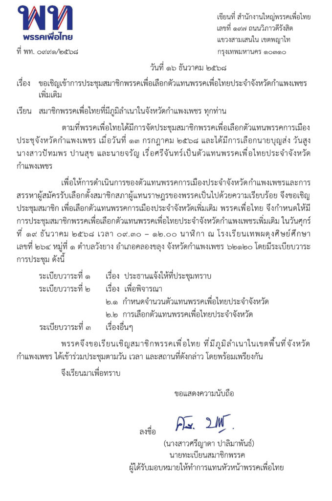 ขอเชิญเข้าการประชุมสมาชิกพรรคเพื่อเลือกตัวแทนพรรคเพื่อไทยประจำจังหวัดสมุทรสงคราม