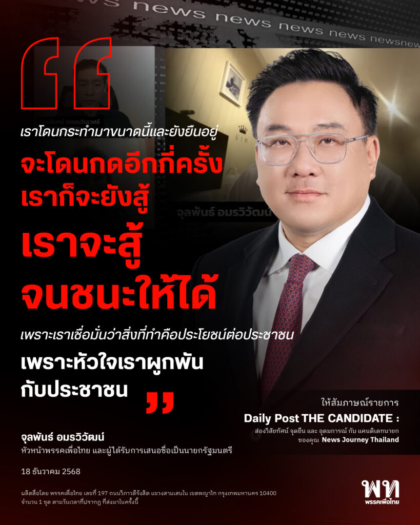 นายจุลพันธ์ อมรวิวัฒน์ หัวหน้าพรรคเพื่อไทยและผู้ได้รับการเสนอชื่อเป็นนายกรัฐมนตรีพรรคเพื่อไทย ให้สัมภาษณ์ในรายการ Daily Post THE CANDIDATE : ส่องวิสัยทัศน์ จุดยืน และ อุดมการณ์ กับ แคนดิเดทนายกของคุณ ทางช่อง News Journey Thailand ดำเนินรายการโดย นายชมะนันทน์ วรรณวินเวศร์ และ นางสาวตวงพร อัศววิไล ได้ย้ำถึงจุดยืนของพรรคเพื่อไทยที่แม้จะโดนกระทำ (ยุบพรรค-วินิจฉัยให้นายกรัฐมนตรีพ้นจากตำแหน่ง) กี่ครั้งก็ยังยืนหยัดต่อสู้ เพราะพรรคเพื่อไทยผูกพันกับประชาชน ได้รับโอกาสจากประชาชน และเรายึดมั่นอุดมการณ์ของเราที่เชื่อว่าจะแก้ไขปัญหาให้พี่น้องประชาชนได้ เราจึงยังคงยืนอยู่ตรงนี้และสู้ต่อจนกว่าจะชนะเพื่อประโยชน์ประชาชน