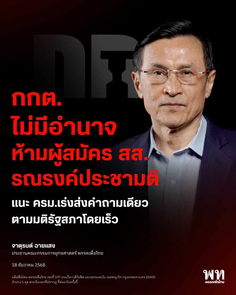 นายจาตุรนต์ ฉายแสง อดีต สส. พรรคเพื่อไทย โต้กรณีเลขาธิการ กกต. ที่ระบุทำนองว่า “พรรคการเมือง-ผู้สมัคร สส.ห้ามชี้นำ” โดยย้ำว่าข้อห้ามตาม พ.ร.บ.ประชามติ มาตรา 14 เป็นข้อห้ามที่ใช้กับ “กกต.” ในการเผยแพร่ข้อมูล ไม่ใช่ห้ามพรรคการเมืองหรือประชาชนรณรงค์-โน้มน้าวการออกเสียง ซึ่งกฎหมายมาตรา 17 รับรองให้ทำได้อย่างเสรีและเท่าเทียม พร้อมระบุ กกต.ไม่มีอำนาจห้ามผู้สมัครรับเลือกตั้งแสดงความคิดเห็นเรื่องประชามติ และชี้ด้วยว่าปมประชามติสะดุดไม่ได้อยู่ที่ กกต. แต่เกิดจาก ครม.ส่งคำถามไปเกิน ทั้งที่มติรัฐสภาตกลงให้มีคำถามเดียว โดยนายจาตุรนต์ โพสต์เฟซบุ๊กข้อความดังนี้